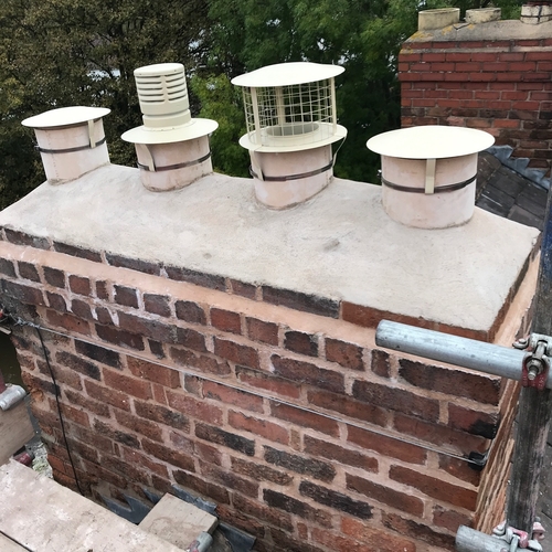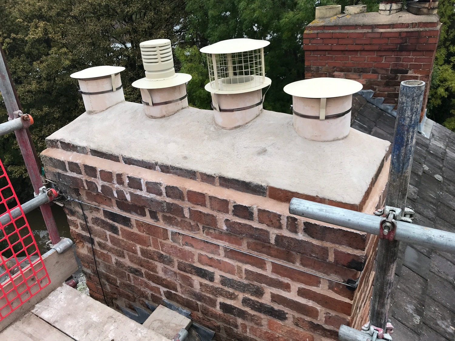 Chimney re pointed with lime mortar and new buff coloured pots and cowls to match on grade 2 listed property