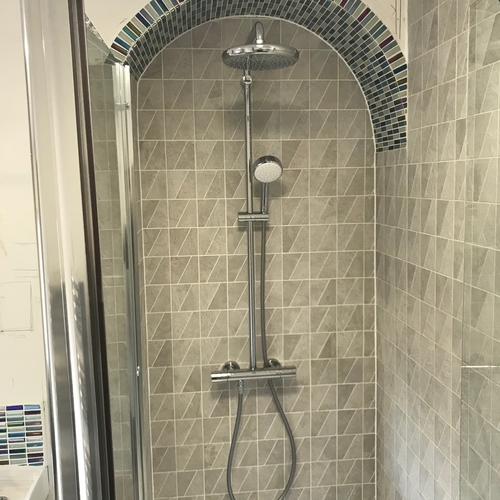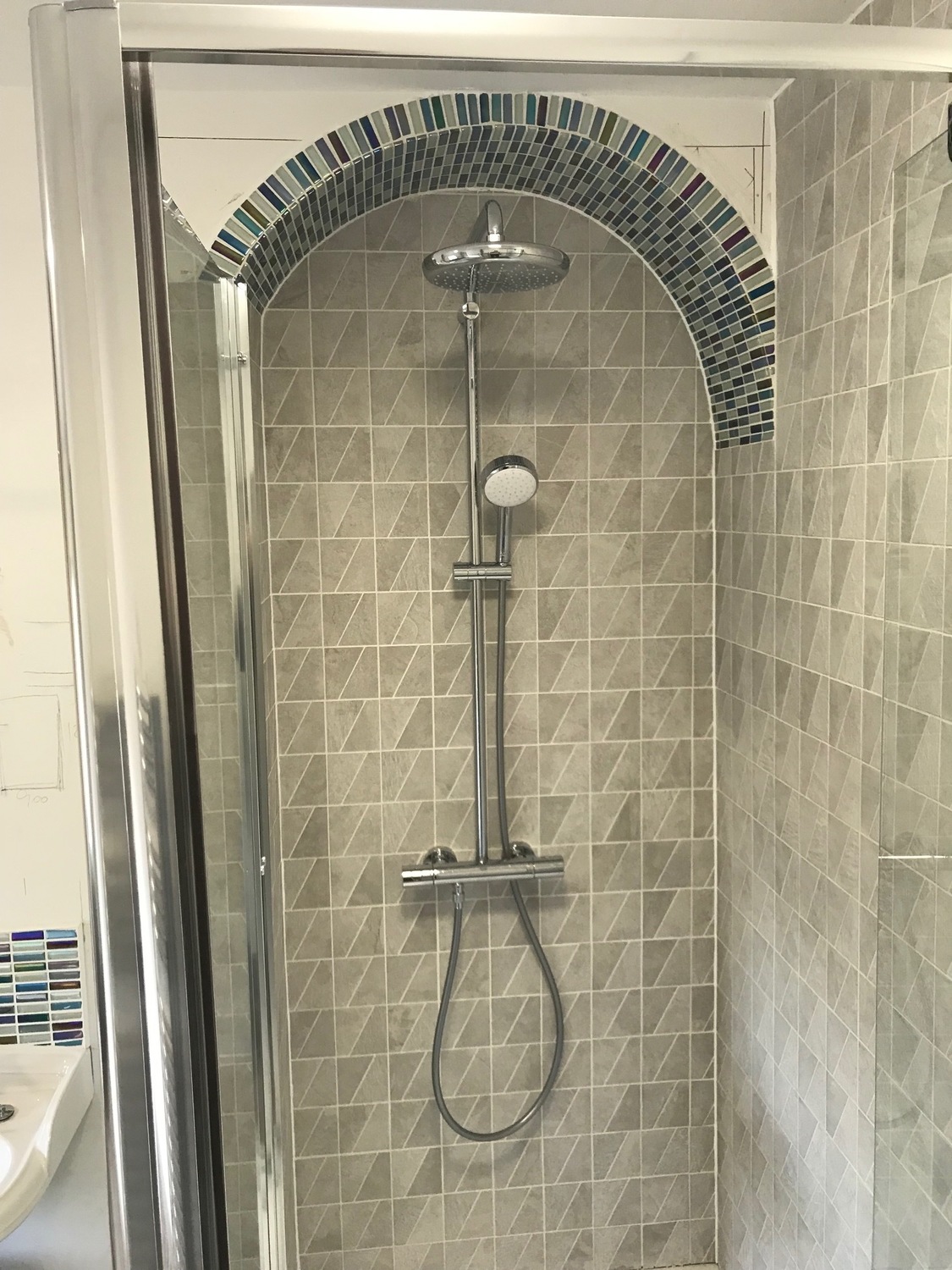 New shower fitted into chimney alcove and tiled with mosaics