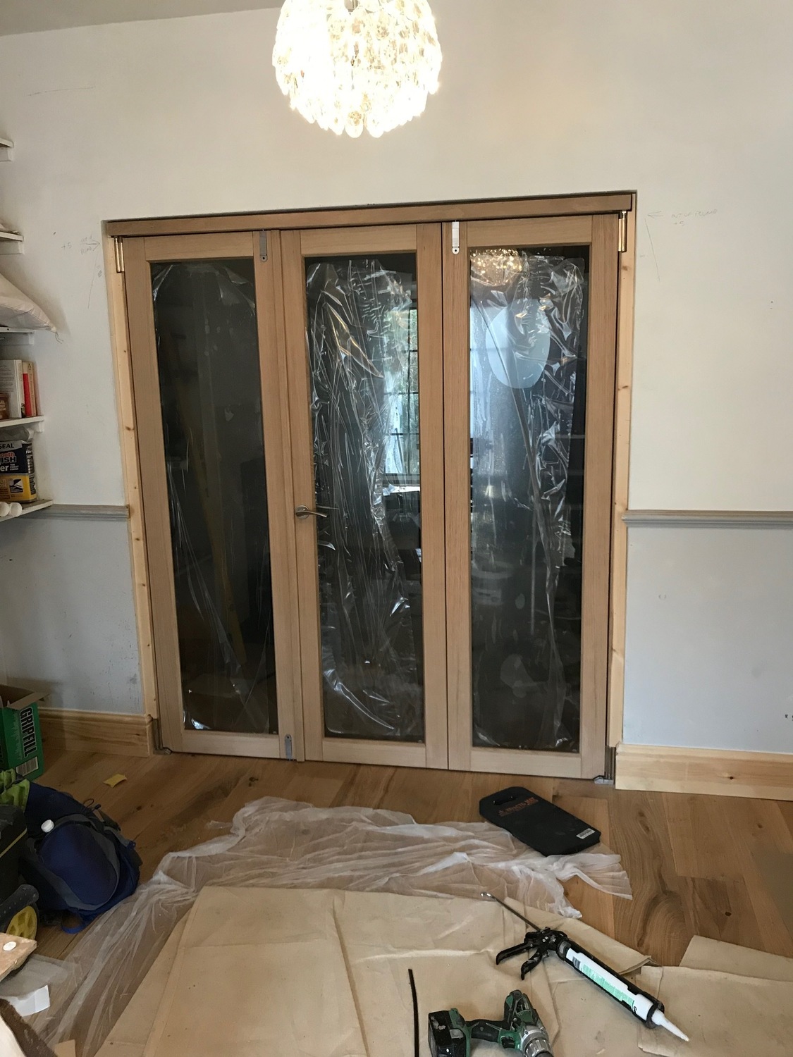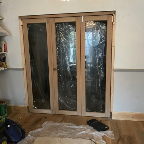 New oak bi fold doors fitted into existing opening in listed house